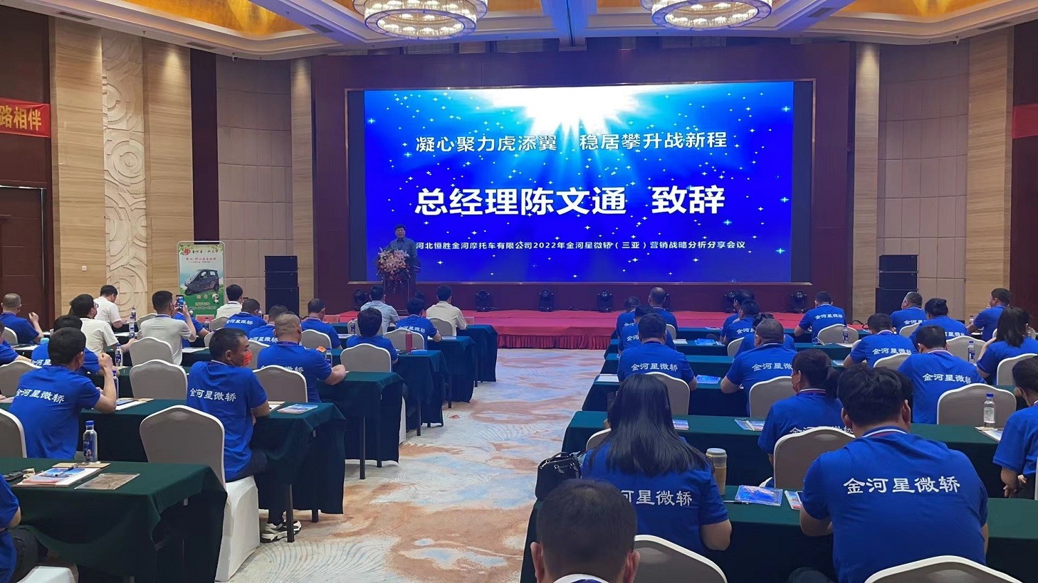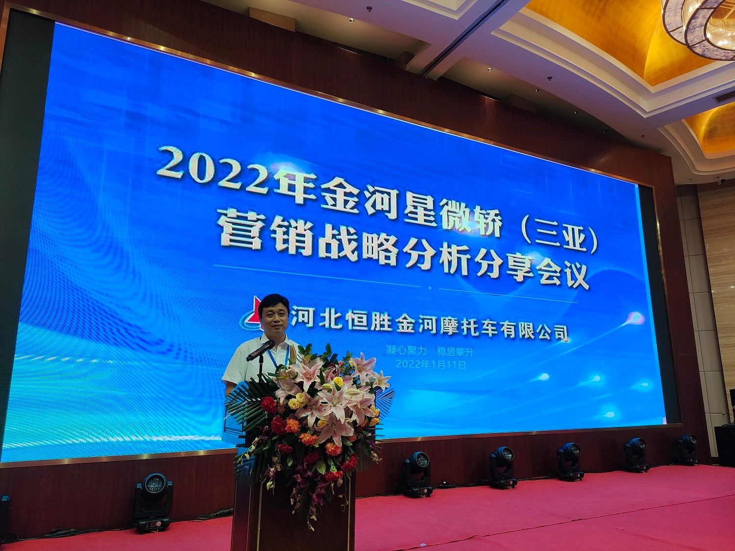 號角已吹響,揚鞭在腳下,河北恒勝金河摩托車(chē)有限公司2022年金河星微轎(三亞)營(yíng)銷(xiāo)戰略分析分享會(huì )議在三亞陽(yáng)光大酒店隆重召開(kāi)。從金河戰隊“金河發(fā)展,我的責任"洪亮的口號開(kāi)啟會(huì )議模式。