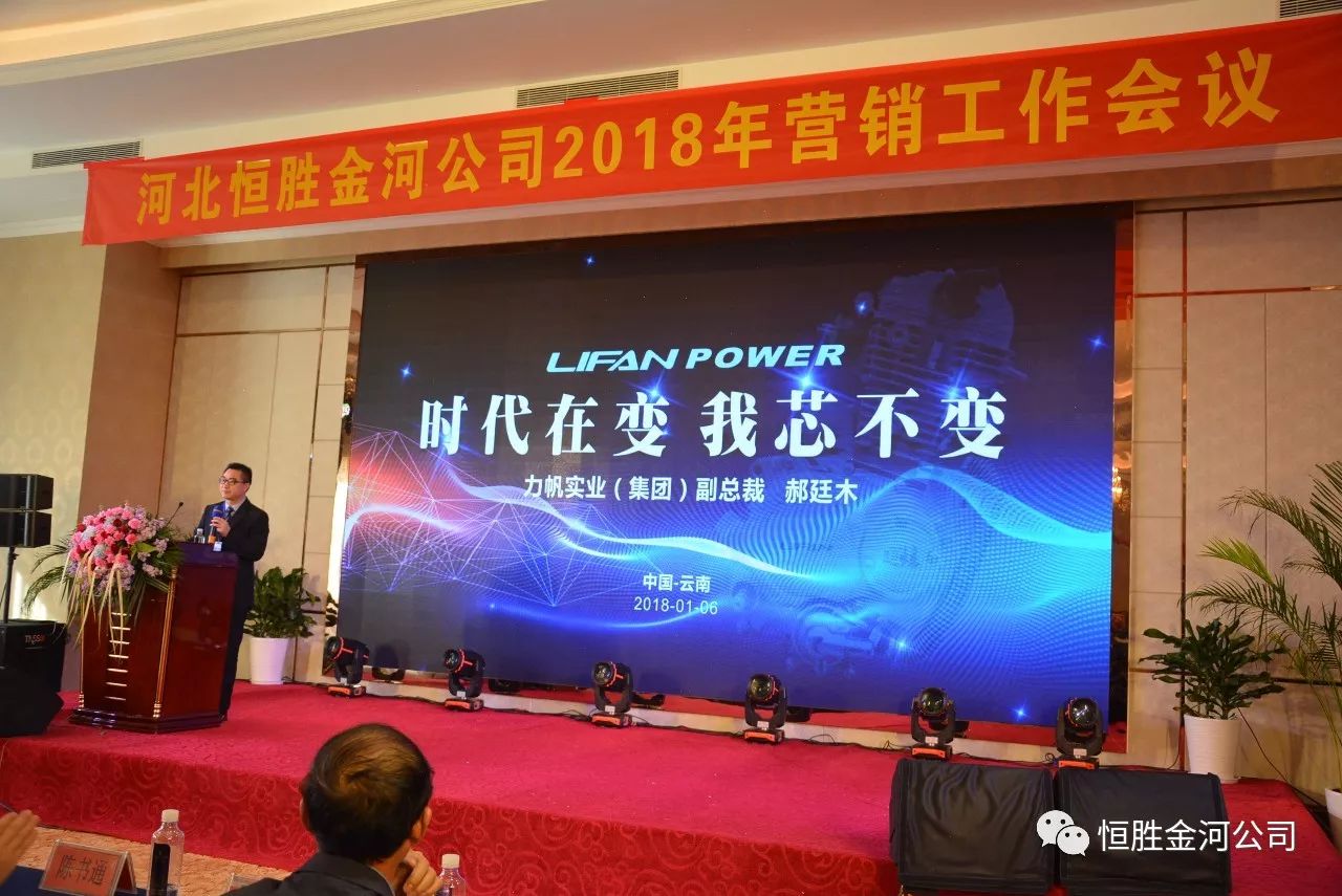 1月6日上午,河北恒勝金河公司2018年?duì)I銷工作會(huì)議在云南省昆明市隆重召開,著名主持人曉楠主持本次會(huì)議,公司總經(jīng)理、技術(shù)部長(zhǎng)、銷售經(jīng)理、力帆發(fā)動(dòng)機(jī)集團(tuán)總裁、營(yíng)銷學(xué)博士教授、眾多傳媒與來自全國(guó)各地的經(jīng)銷商家人,齊聚一堂、共襄盛會(huì)。